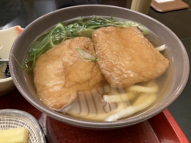 お目当てのきつねうどんを頼んで暫し待っていると運ばれてきました。たっぷりの出汁に浮かぶ揚げとそこに沈むうどん。出汁の香りが鼻を通ると、もう待てないほどの食欲がやって来ます。