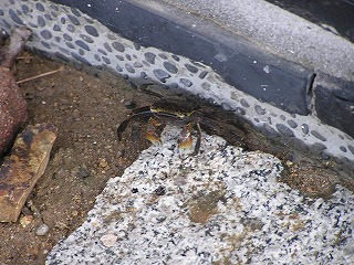 フロントのスタッフの一人が「今日のブログのネタこれでどうですか!?」 と私を呼んでくれたのは夕方頃。 デジカメを持って何があるのか行って見るとそこには一匹のカニが祥吉の玄関横でウロウロとしていました。 そこに植わっている草木に水をやっていると雨だと勘違いして出て来たようです。 びっくりさせないように遠くから望遠でカシャッと撮ってみました。