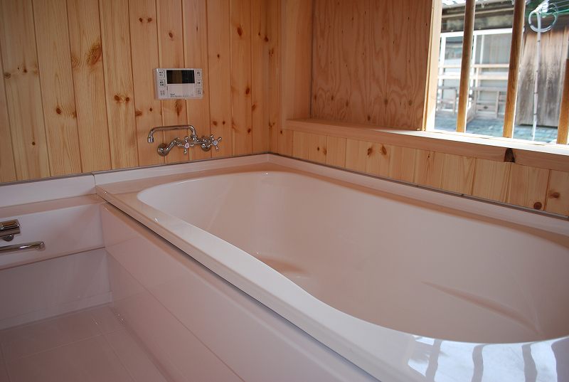 画像はお部屋の一部で、無垢板を敷き詰めた床と塗り壁のお部屋にはベッドが入り、ゆったりとしたお風呂を設えています。