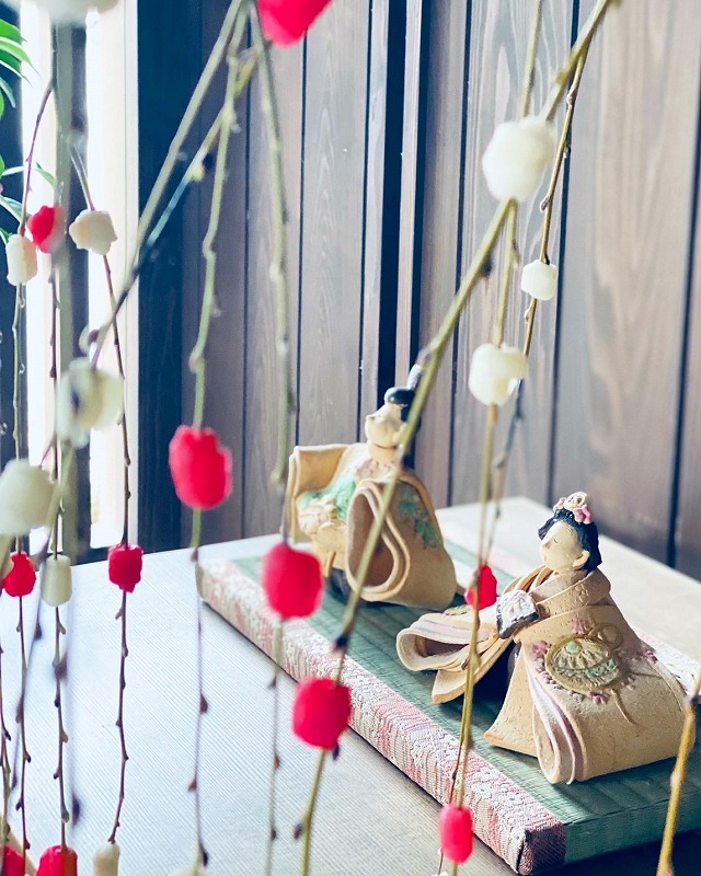 節分が過ぎると祥吉に登場するのはひな人形たちです。 画像は、人形作家葛原順子さん作のひな人形です。 そのいで立ちはいつも優しくて気持ちが和む作品です。 この度も祥吉の玄関に鎮座して皆様をお迎えいたします。お正月から飾る餅花とのコントラストが何とも素敵です。 春待ちひな人形、春を感じて下さいね。