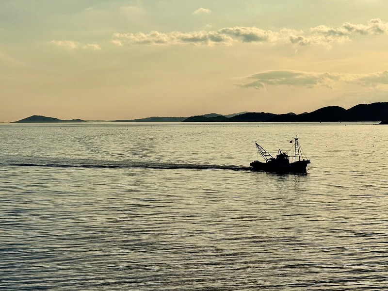 そして、夕刻に穏やかな水面を横切る船をスタッフが撮影してくれました。