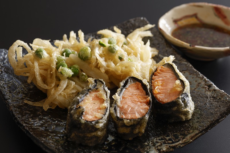 一品目は、サーモンの海苔巻き天婦羅と新玉ねぎとうすい豆のかき揚げです。