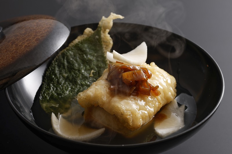 二品目は、伝助穴子の桜揚げ出汁豆腐です。