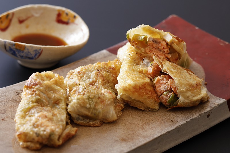 三品目は、白鷺サーモンの湯葉餃子です。