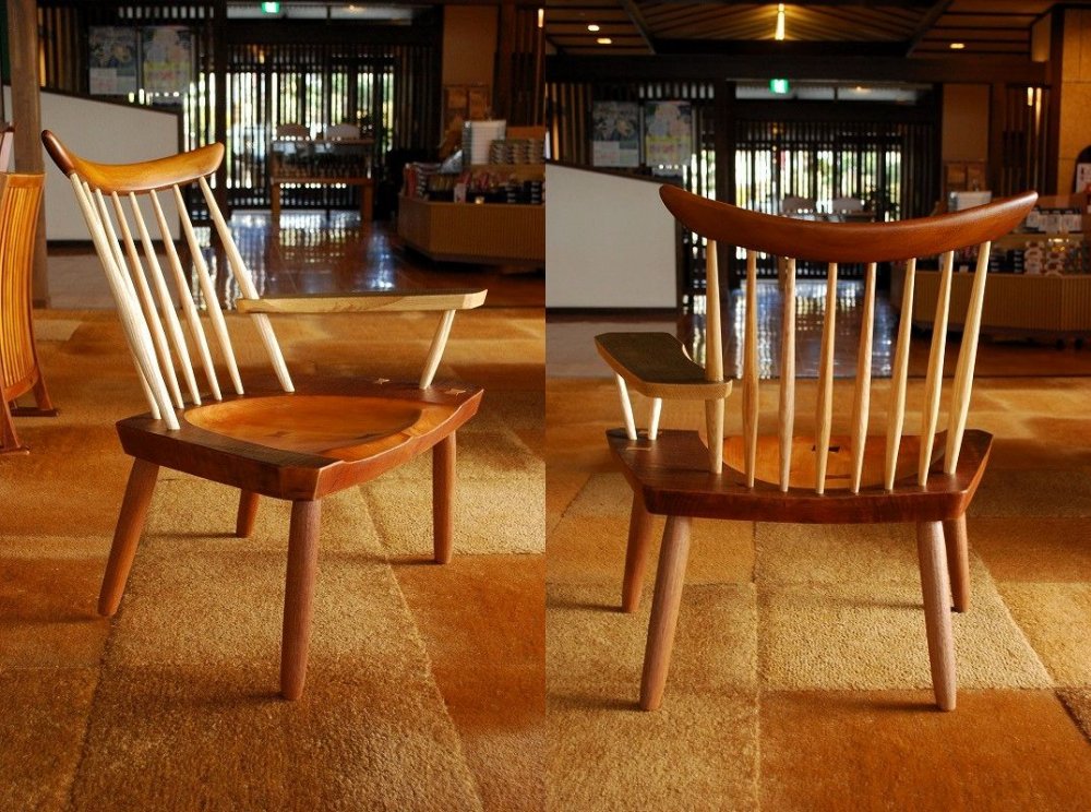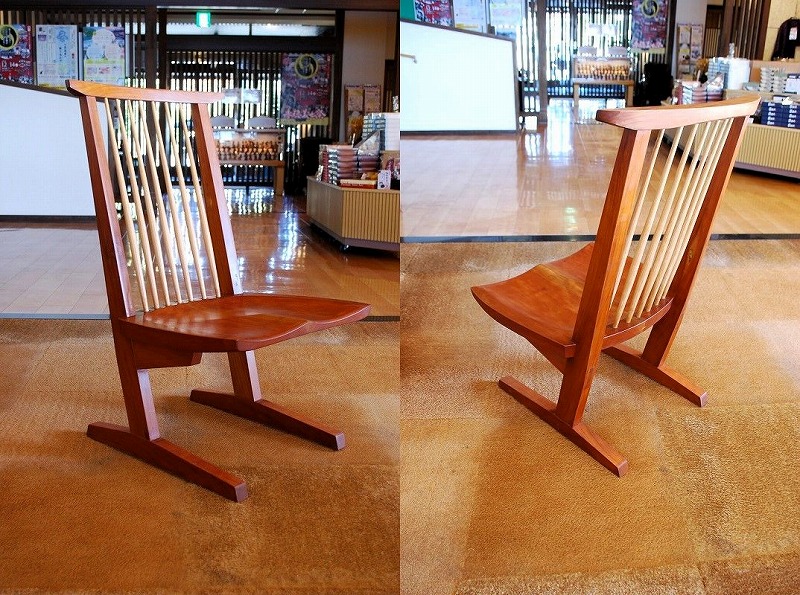 同じく津山のさしこうさんで見つけたチェアは、ジョージナカシマの心を今に伝えるデザインチェアを作る松岡明廣さん。若かりし頃、このデザインの椅子を見た時からいつかはこの椅子を置いてみたいと思っていた椅子。フレームからすっと伸びる座面、そして座面の削り出しの美しさは特筆ものです。背面のフレームも手作業で削り出したように凹凸があるのに気付いてもらえると、この椅子を大好きになるはずです。 |
