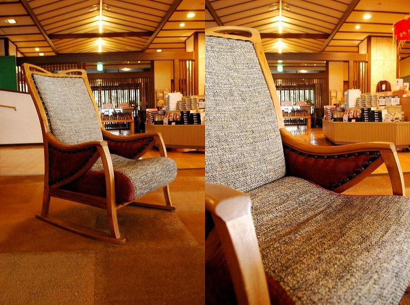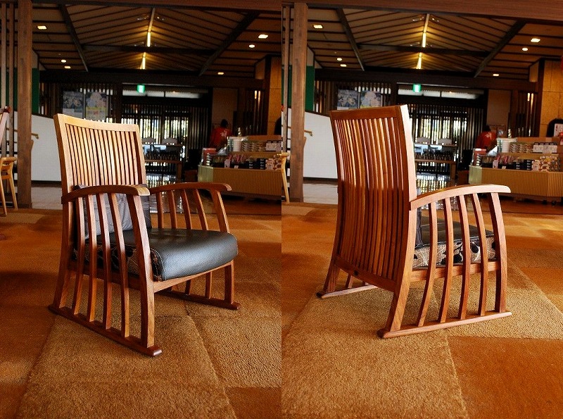 匠工芸さんの椅子を好きになるきっかけになった椅子。とにかく横から見たラインが綺麗。後ろに重心を掛けるとロッキング、前に重心を移すとダイニングチェアになる優れもの。デザインだけでなく実用性にも気を配った素晴らしい椅子。祥吉のロビーでも特に目を引く一脚です。 |